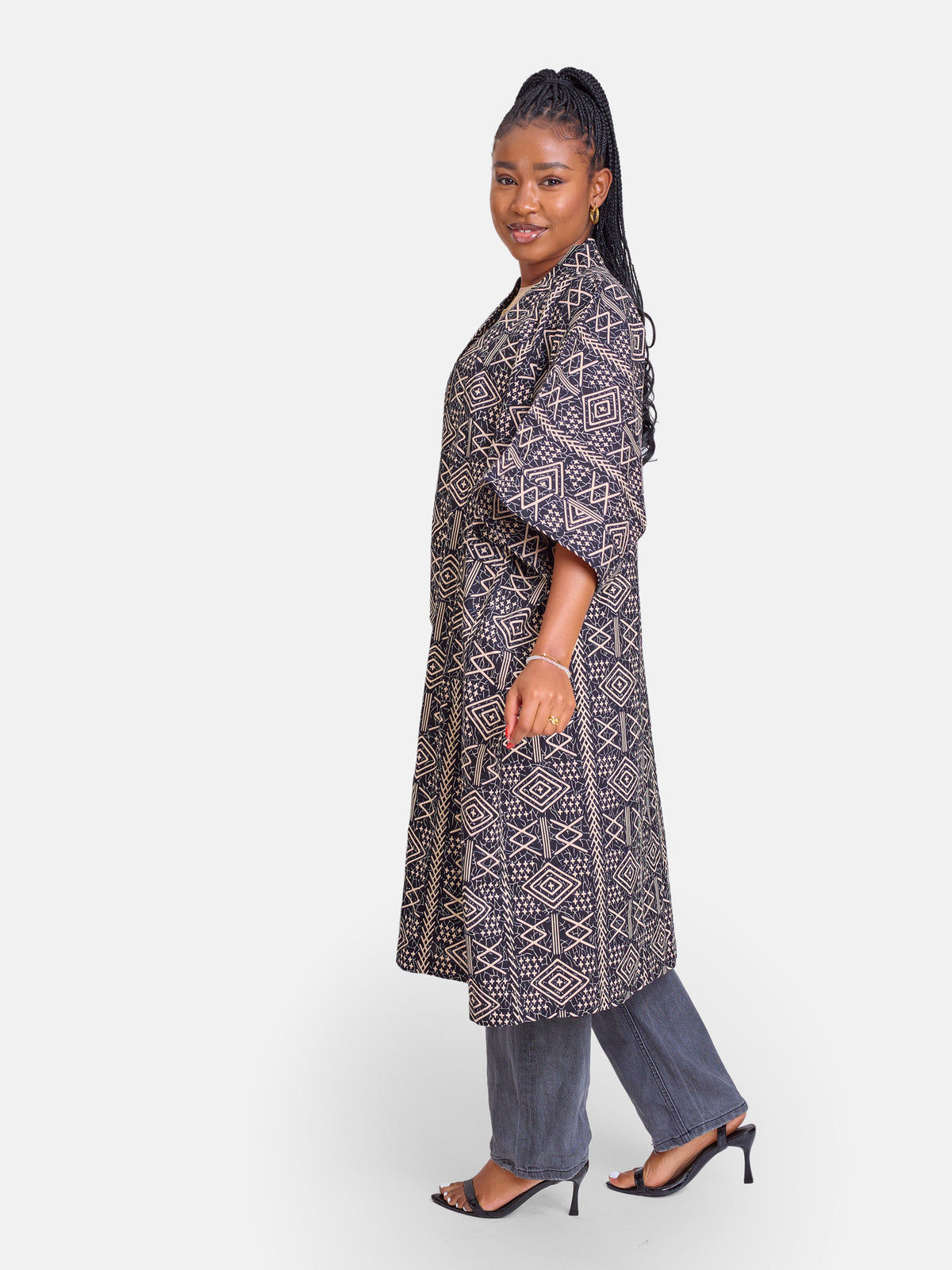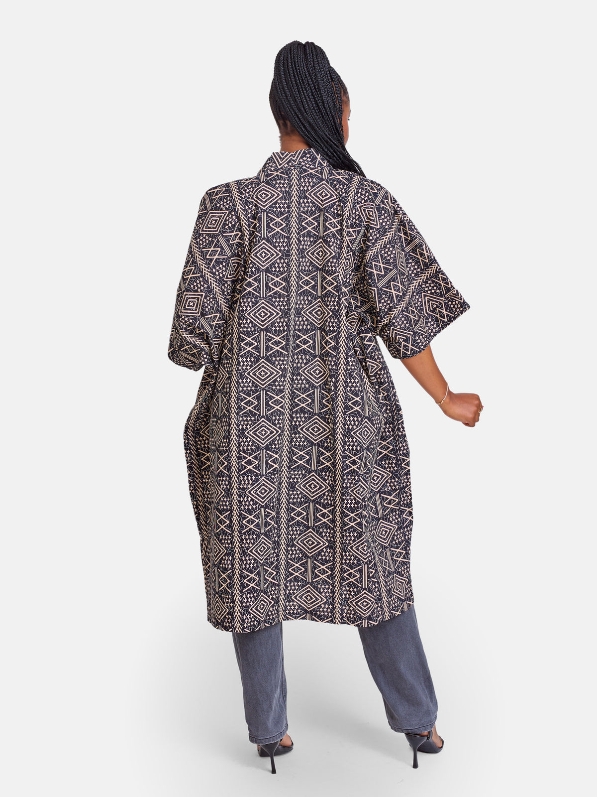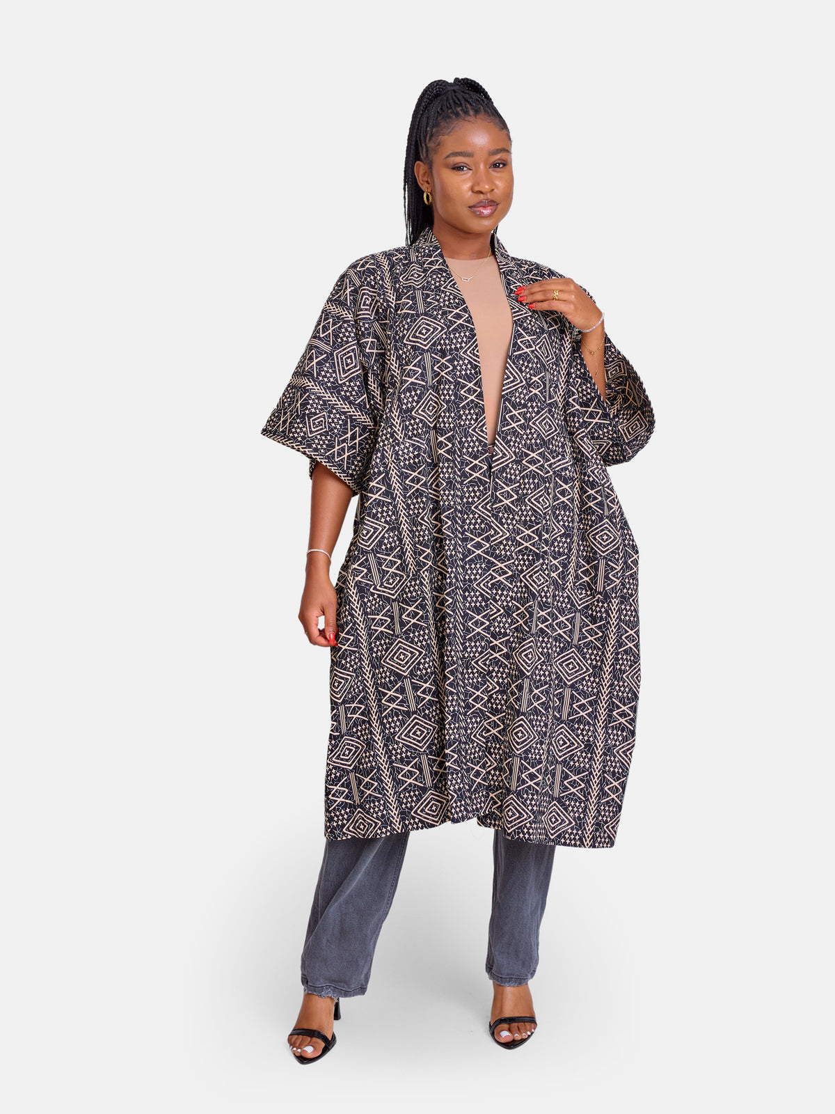 This is an absolute The nuralains must have. It comes in a 3/4 length that’s perfect for the day to day hustle. Our kimonos can be styled as a dress as well.