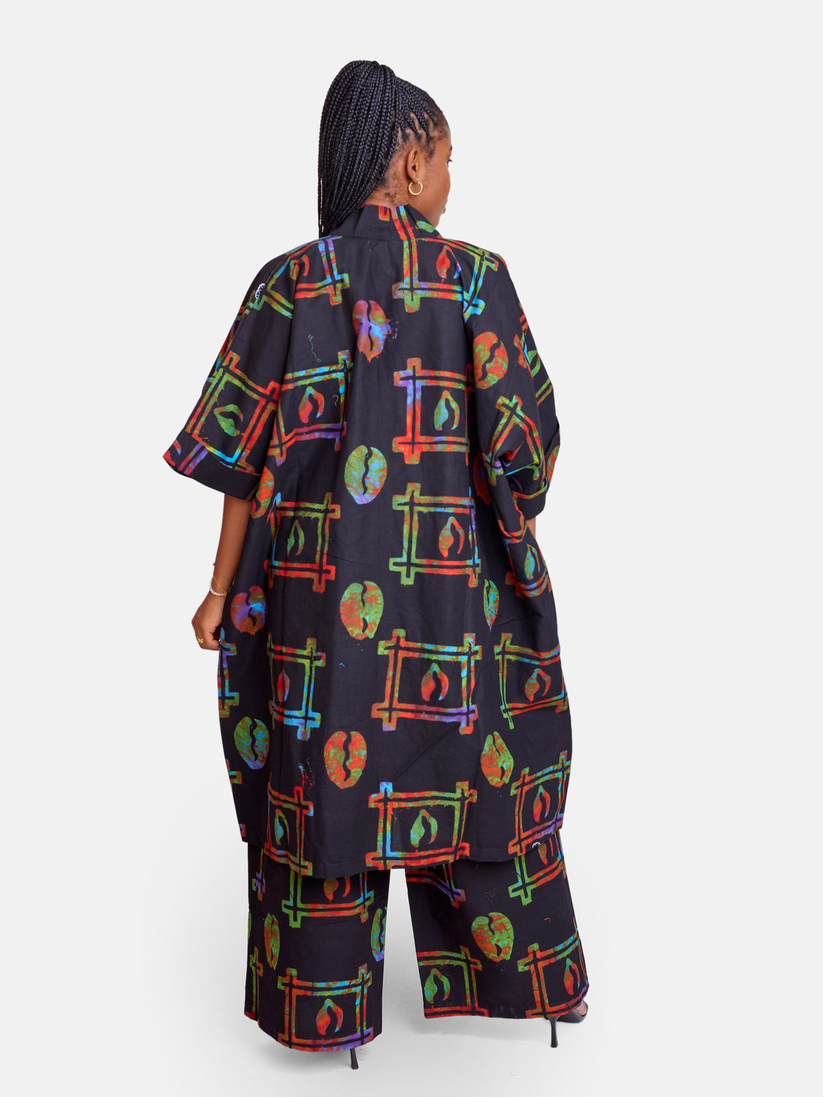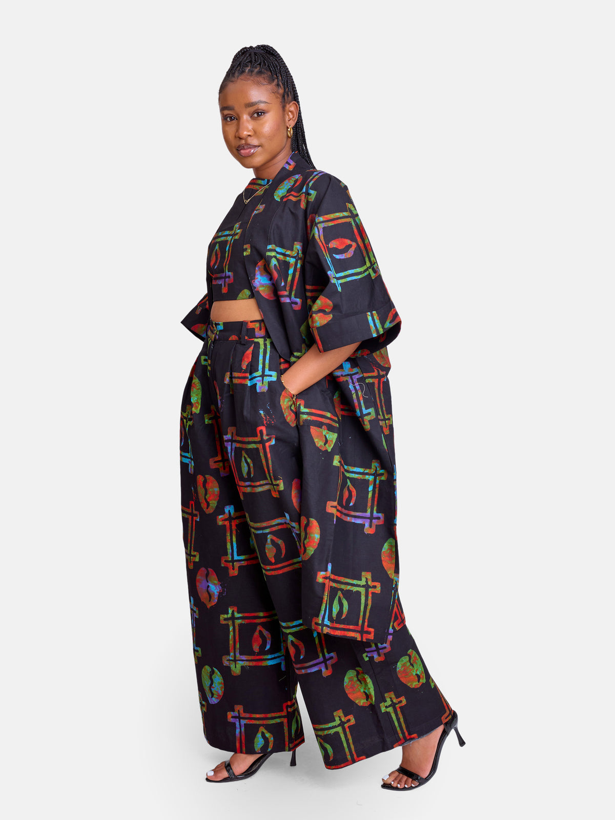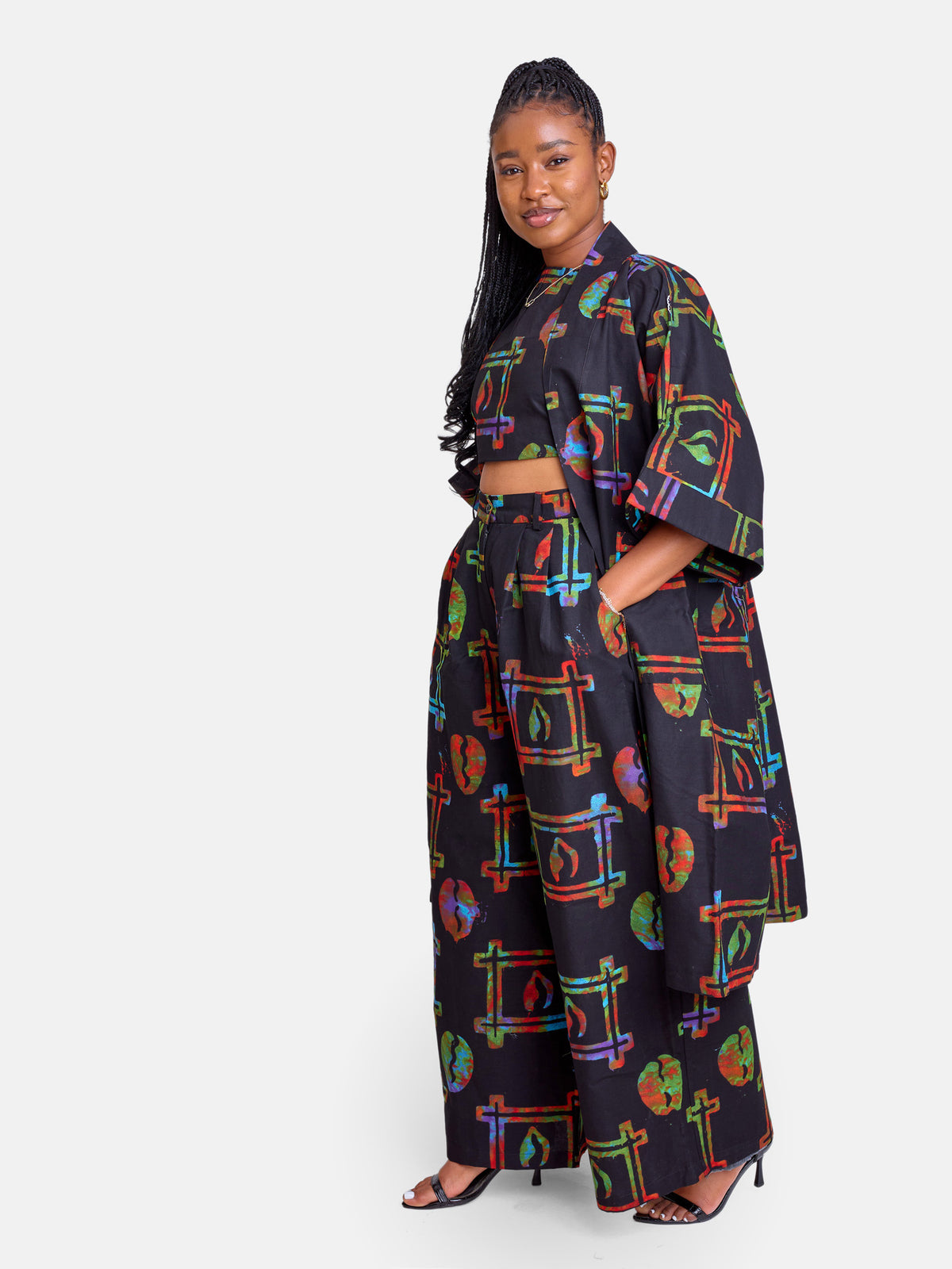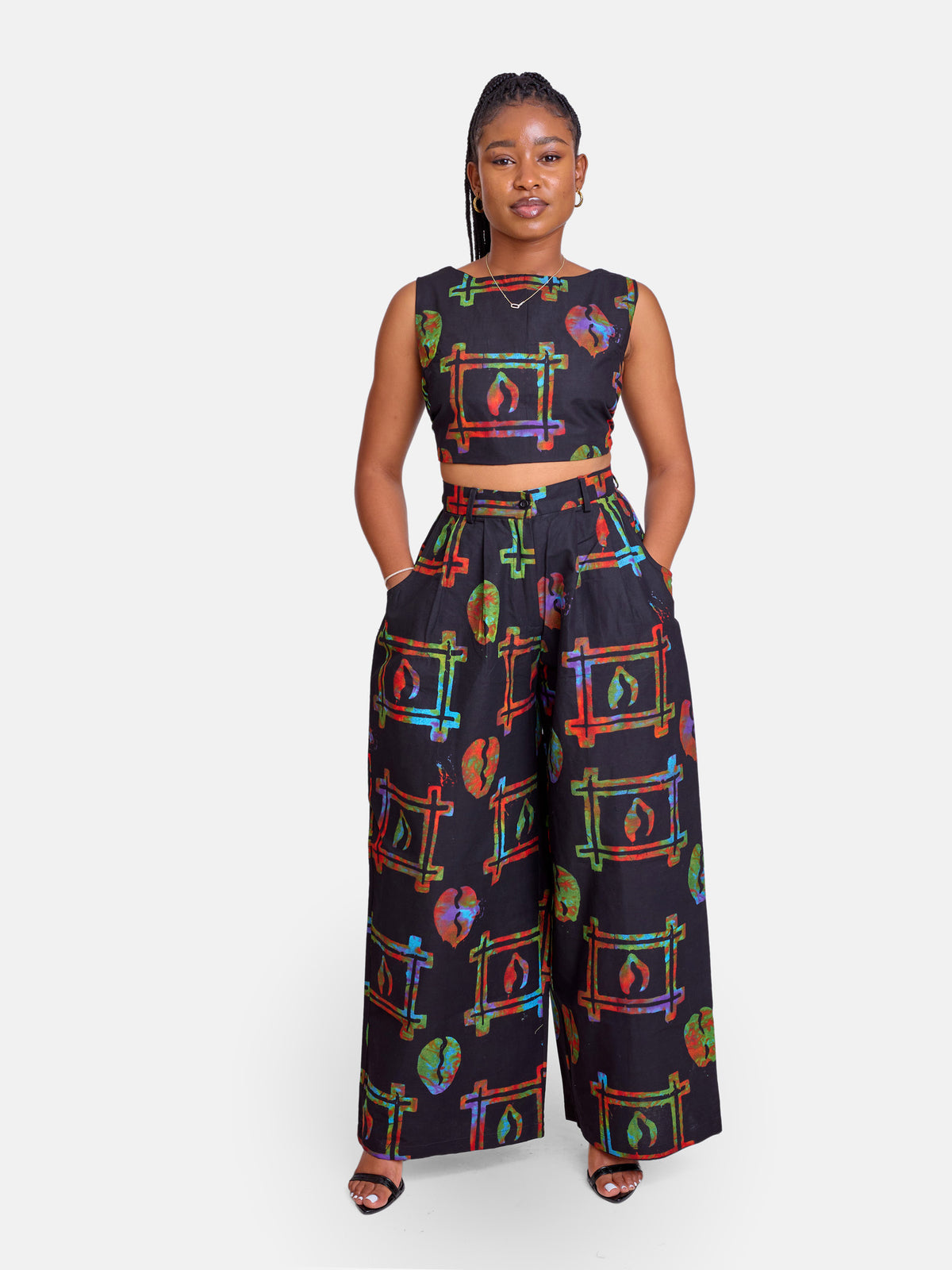 These pants are a wide-legged, floor length and with pockets, the back of the waist has an elastic band that helps with extra comfort.
